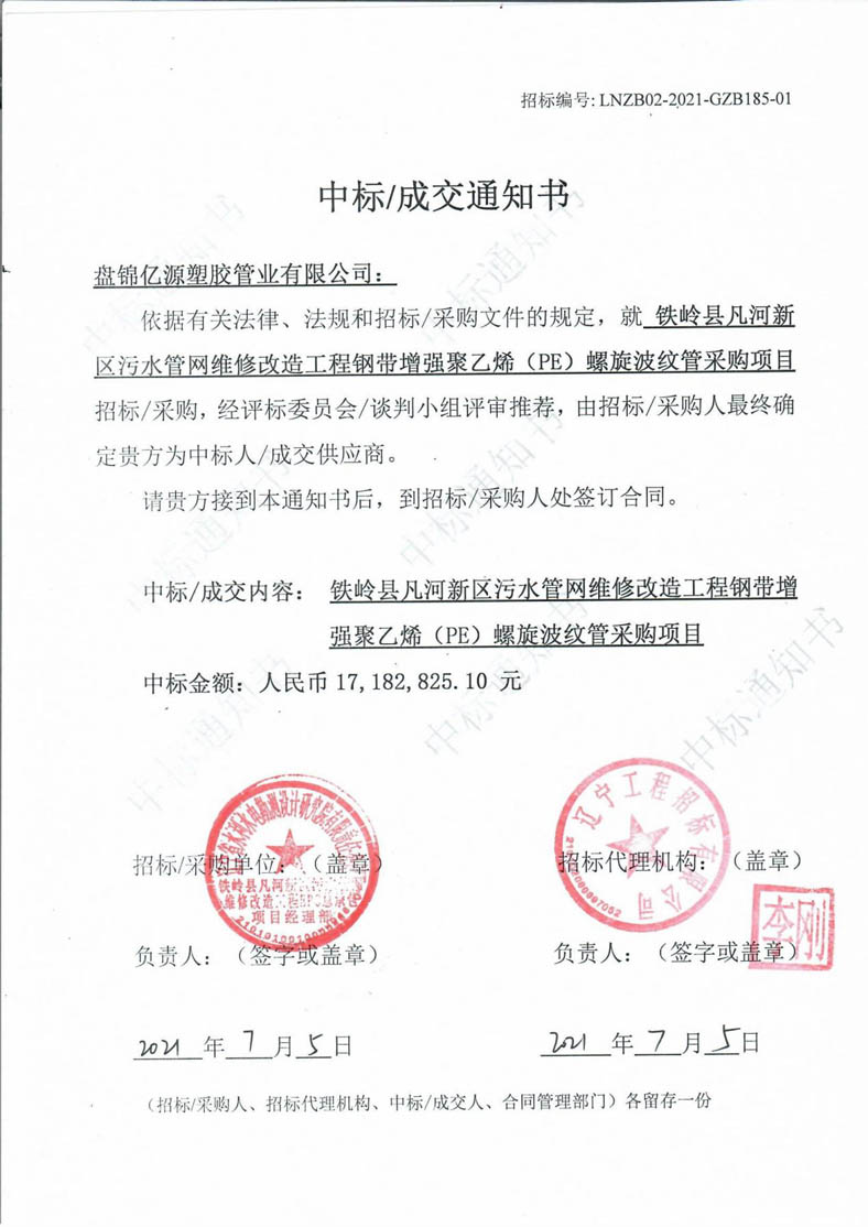 2021年(nián)6月(yuè)份我公司積極參與該項目投標,並在眾(zhòng)多參與投標企業中脫穎而出,成功中標該項目管材獨家(jiā)供應商;中標通知書: