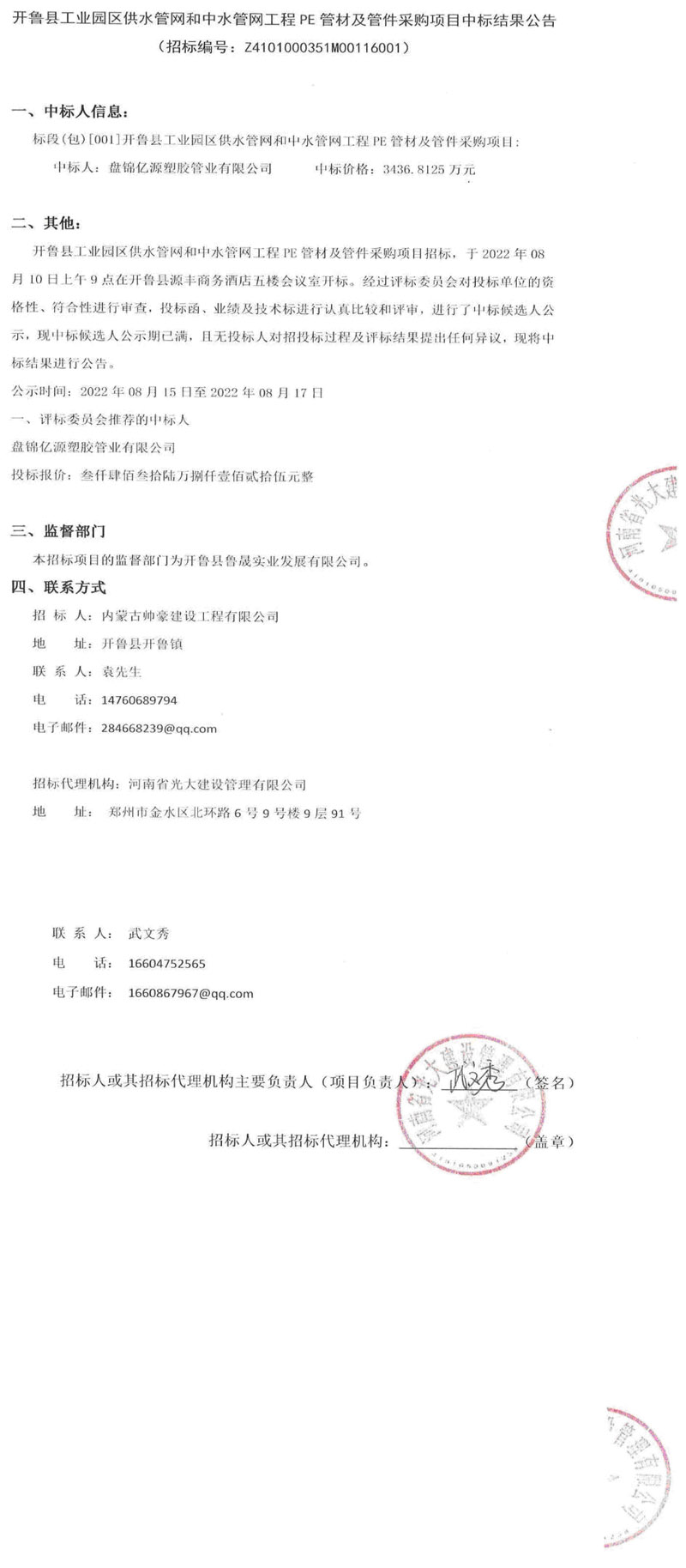 2022年8月10日,盤錦果冻传媒MC191蜜桃塑膠管業有限公司憑借綜合實力成功中(zhōng)標開魯縣工業園區供水管(guǎn)網和中水管網項(xiàng)目工(gōng)程,中標金額:3436.8125萬元。