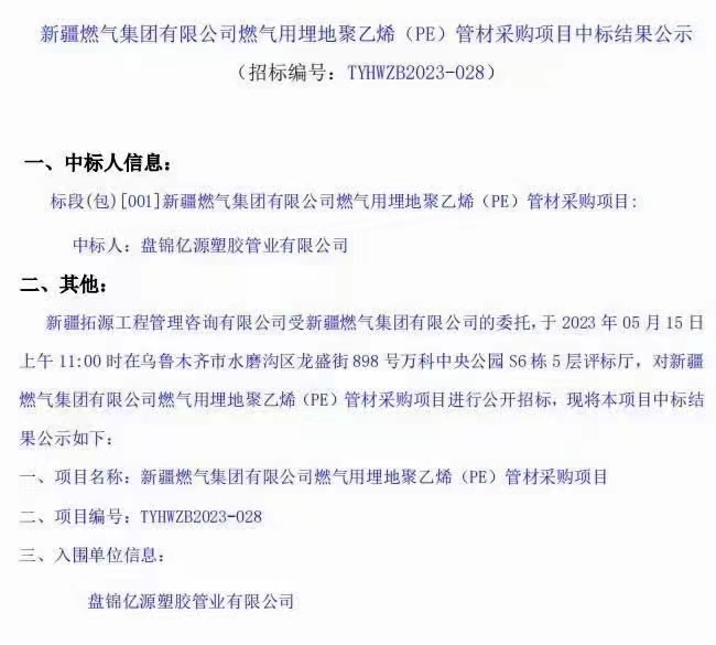 熱烈慶祝(zhù)億(yì)源管業中標 新(xīn)疆燃氣集團有限公司燃氣用埋地聚乙烯(PE)管(guǎn)材采購(gòu)項目